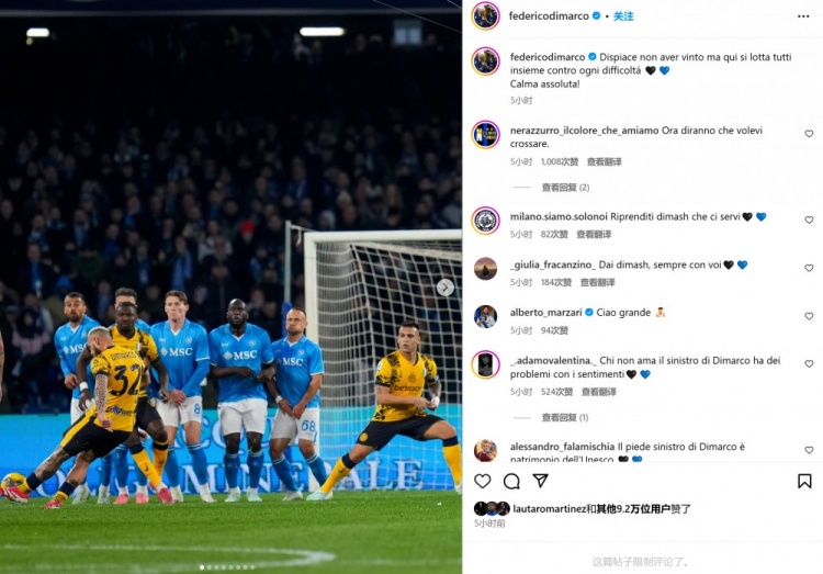 本場(chǎng)比賽迪馬爾科上半場(chǎng)打進(jìn)精彩任意球,賽後他也在個(gè)人社媒曬出破門(mén)瞬間照片,配文寫(xiě)道:“很遺憾未能取得勝利,但是面對勁敵我們全隊都在團結拼搏?!?/p>