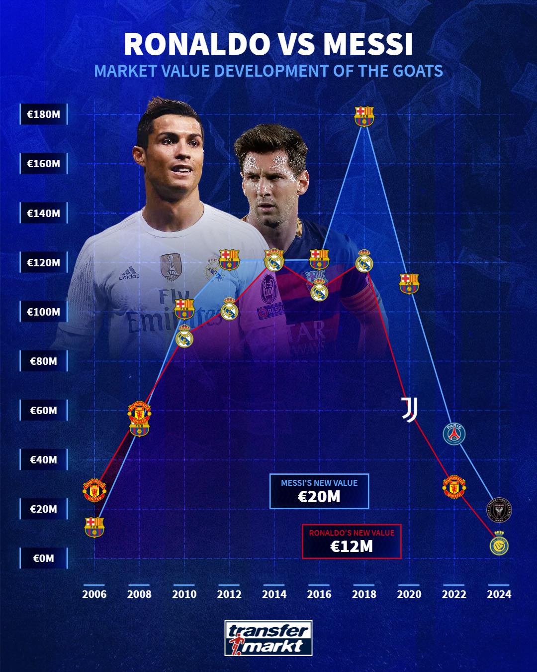12月15日訊 德轉社媒曬出梅西、C羅生涯身價(jià)走勢圖,並寫(xiě)道:歷史最佳們(goats)的圖。