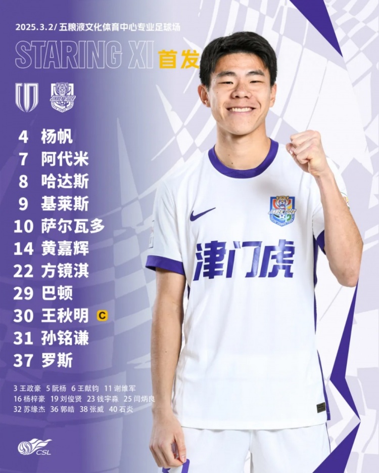 天津津門(mén)虎首發(fā):4-楊帆,7-阿代米(89’ 11-謝維軍),8-哈達斯(95’ 40-石炎),9-基萊斯,10-薩爾瓦多,14-黃嘉輝,22-方鏡淇,29-巴頓(82‘ 3-王政豪),30-王秋明(82‘ 5-阮楊),31-孫銘謙(82‘ 16-楊梓豪),37-羅斯