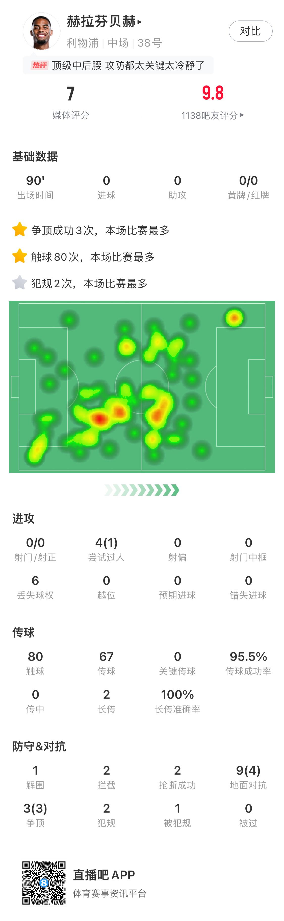 赫拉芬貝赫本賽季能登場(chǎng)的比賽場(chǎng)場(chǎng)首發(fā),在6號位被斯洛特徹底激活。本輪聯(lián)賽在羅伯遜被罰下的情況下,赫拉芬貝赫身兼中衛。
