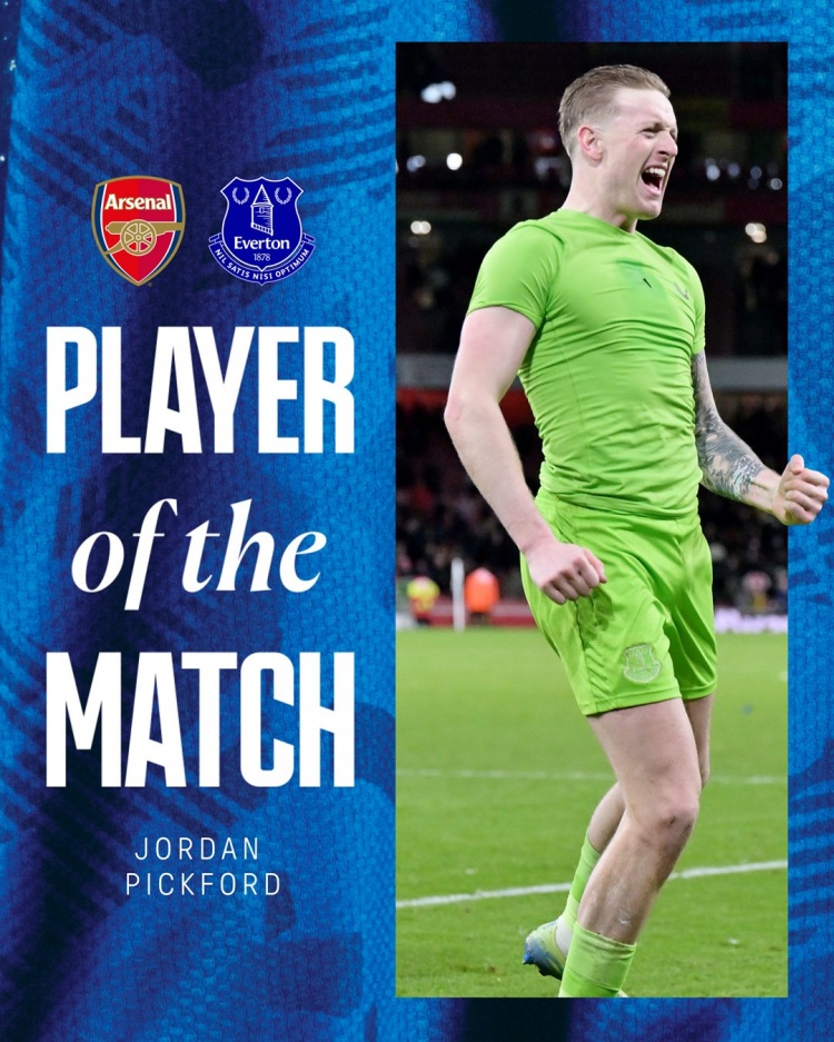 埃弗頓官方社媒曬出海報,宣佈皮克福德獲得62%的球迷投票,當選此役埃弗頓隊內最佳球員。