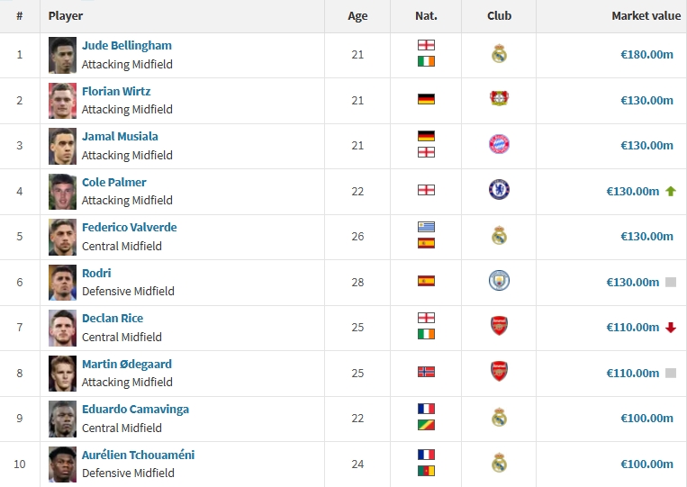 發(fā)布時(shí)間:2024年12月16日 22:03點(diǎn)擊:欄目:足球新聞 德轉最新全球中場(chǎng)身價(jià)排名前十(單位:歐元):1. 貝林厄姆:1.8億2-6. 維爾茨、穆西亞拉、帕爾默、巴爾韋德、羅德裡:1.3億7-8. 賴(lài)斯、厄德高:1.1億9-10. 卡馬文加、瓊阿梅尼:1億 除特別注明外,本站所有內容均為24直播網(wǎng)整理排版,轉載請注明出處:少了誰(shuí)?全球中場(chǎng)身價(jià)排名前10:帕爾默從10名開(kāi)外沖到并列第2 本文標簽: 足球 西甲 皇家馬德里 英超 切爾西 德甲 勒沃庫森 拜仁慕尼黑 曼城 阿森納 貝林厄姆