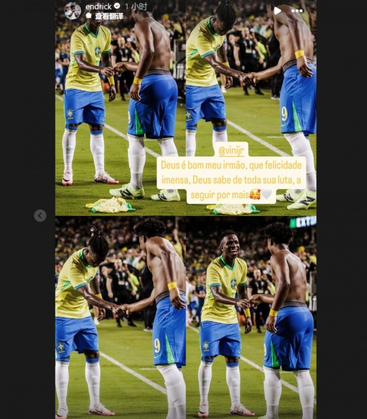 恩德裡克曬出自己在巴西國傢隊和維尼修斯的互動(dòng)照,並配文:“上帝是多麼仁慈,我的兄弟。我真是太高興瞭!”