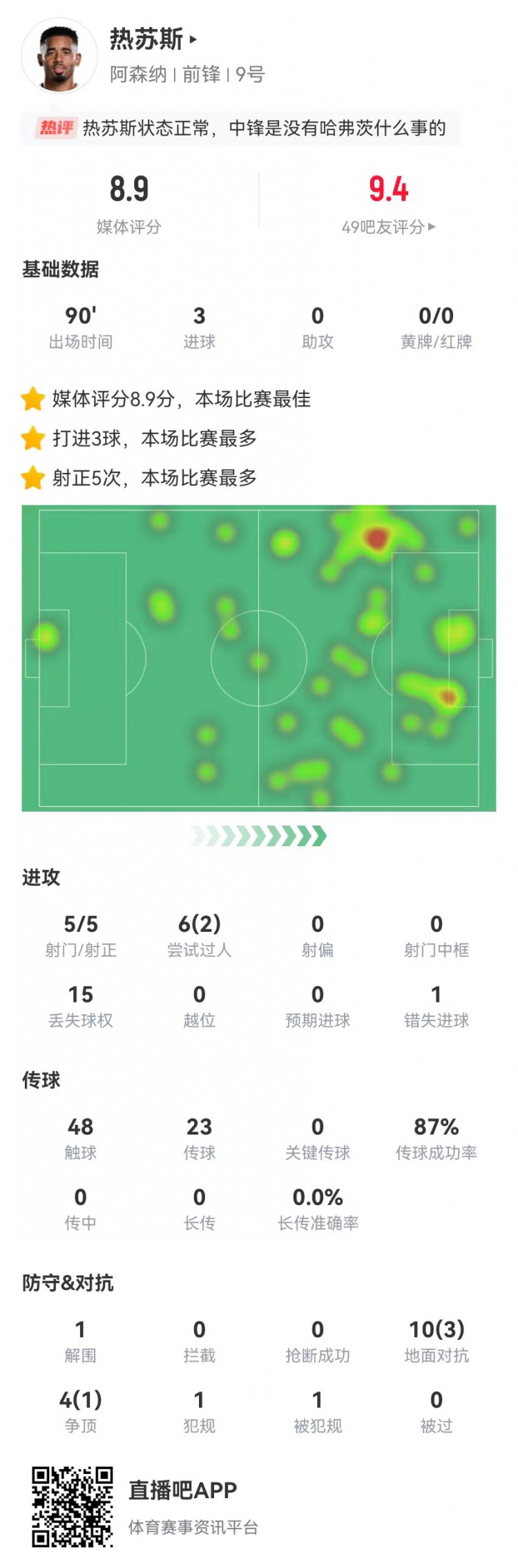 12月19日訊 阿森納在本輪聯(lián)賽杯3-2力克水晶宮,熱蘇斯本場(chǎng)數據如下: